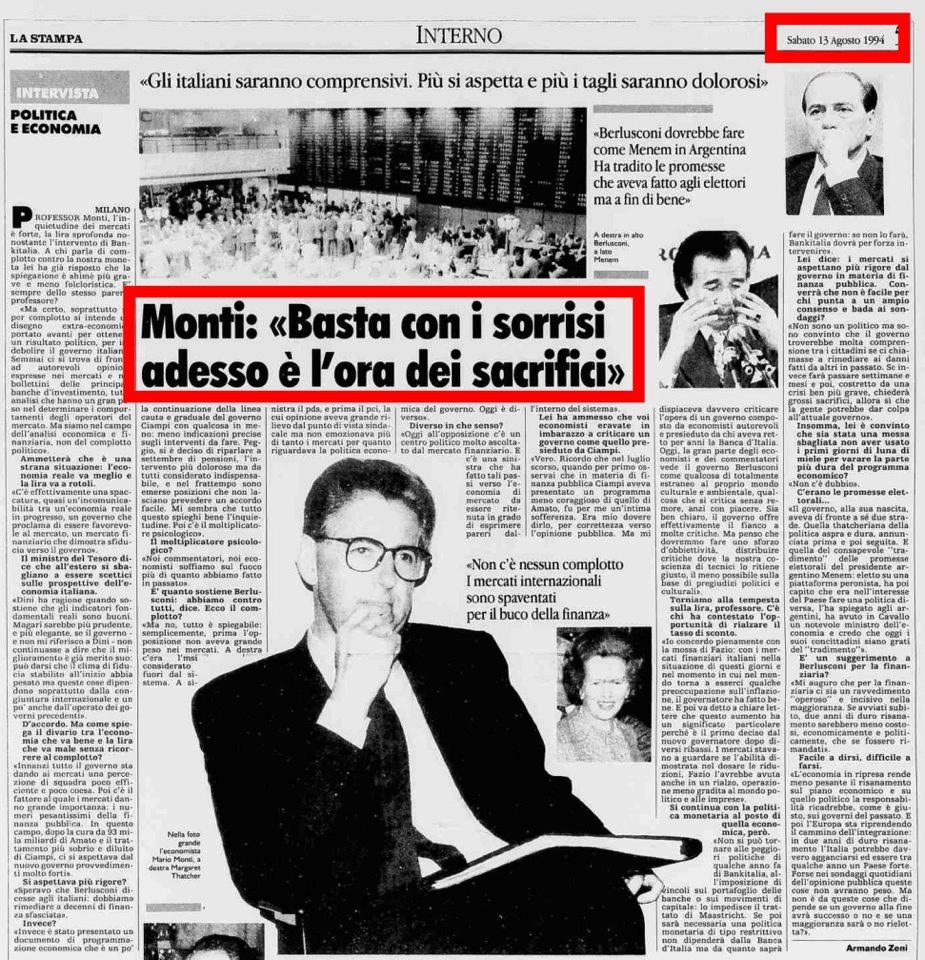 Ora, forse non molti sanno chi sia Carlos Saúl Menem Akil, presidente dell’Argentina dall’8 luglio 1989 al 10 dicembre 1999. Ebbene, vi ricordate il crollo economico dell’Argentina? Ecco, è dovuto alla sua politica economica che auspicava Monti per l’Italia nel 1994.